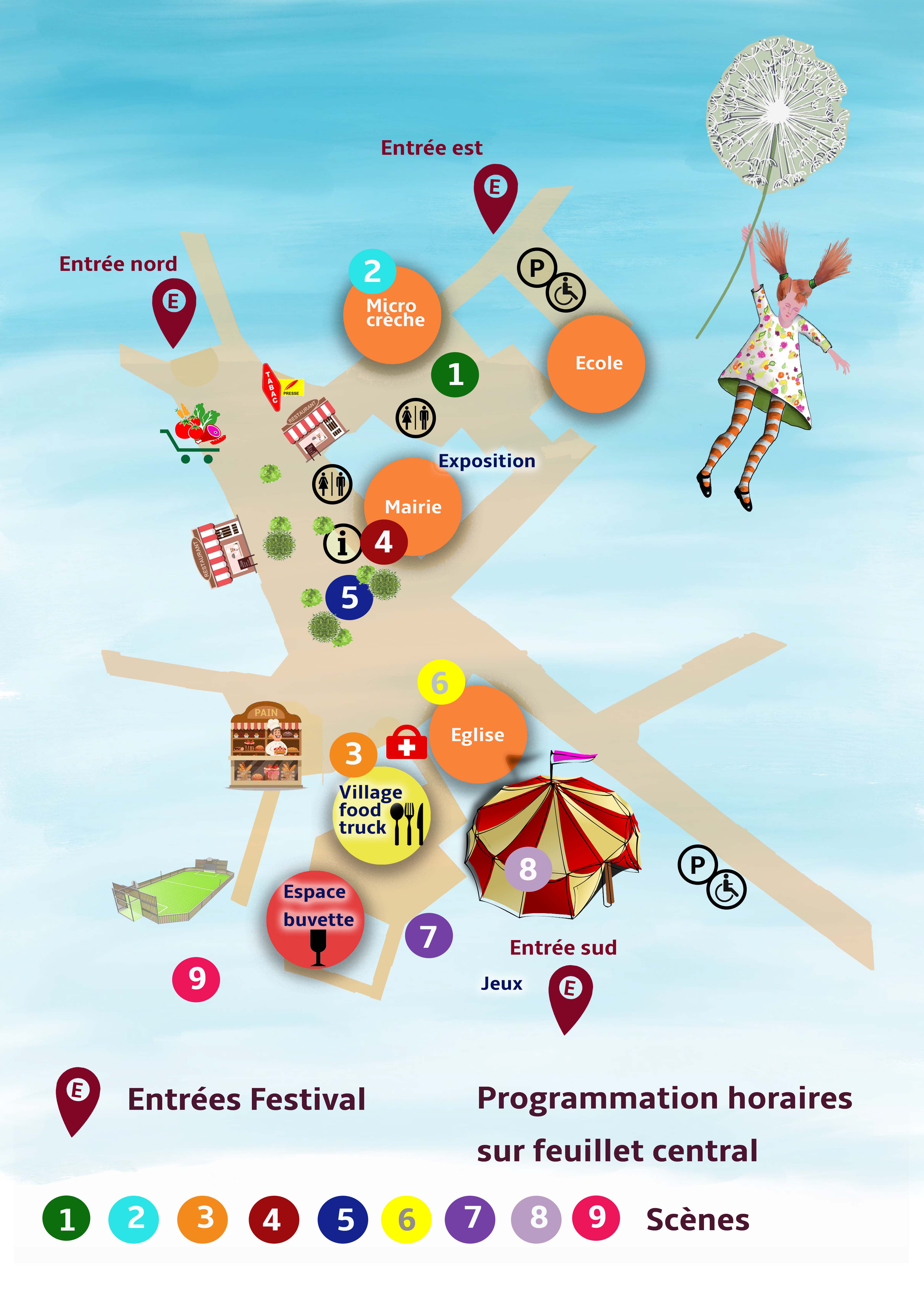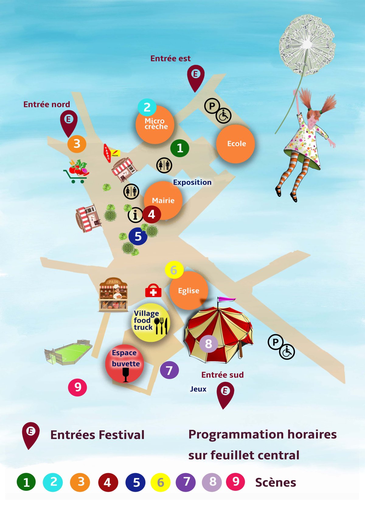 - Des programmes du festival sont disponibles aux entrées du village pour que vous ne manquiez rien des spectacles.